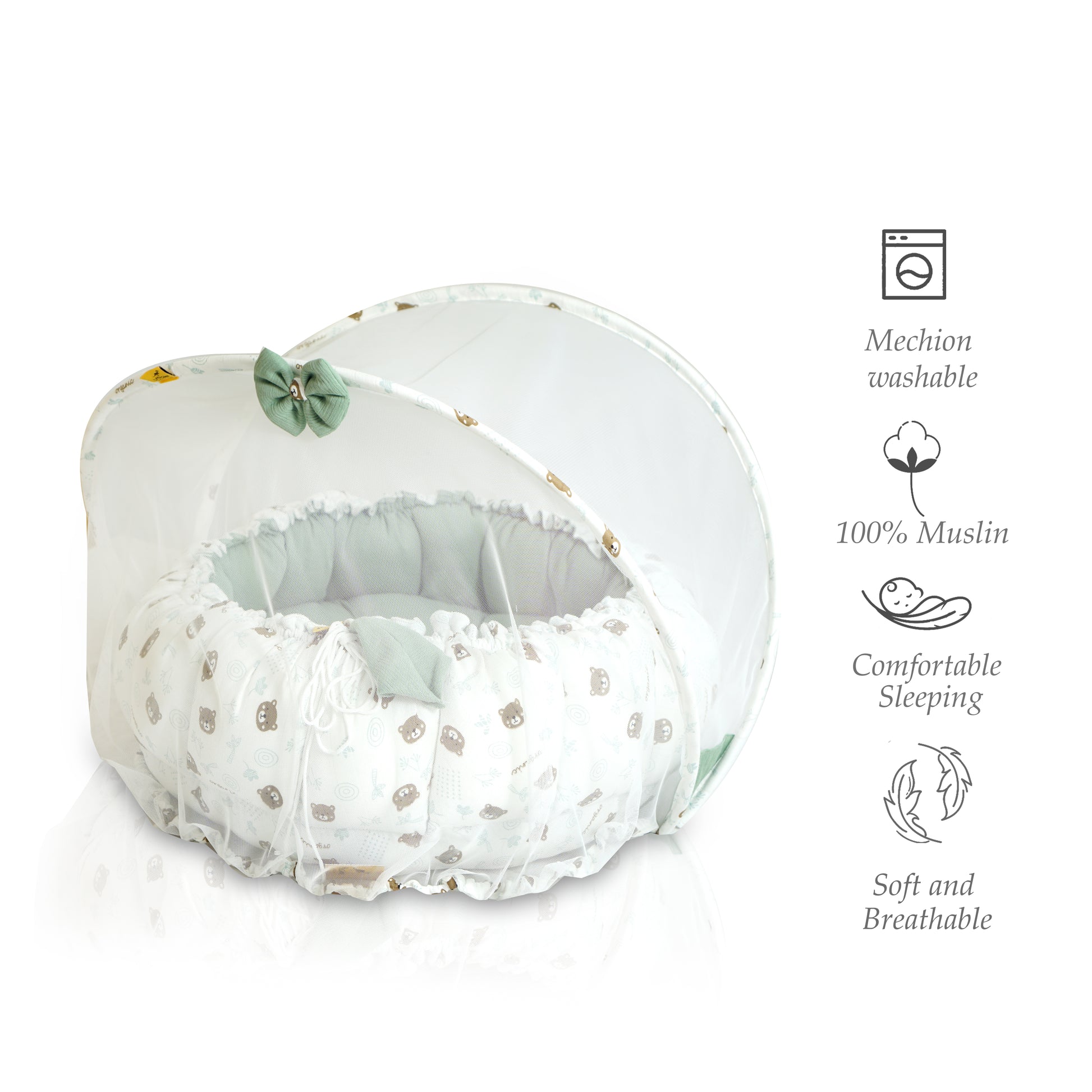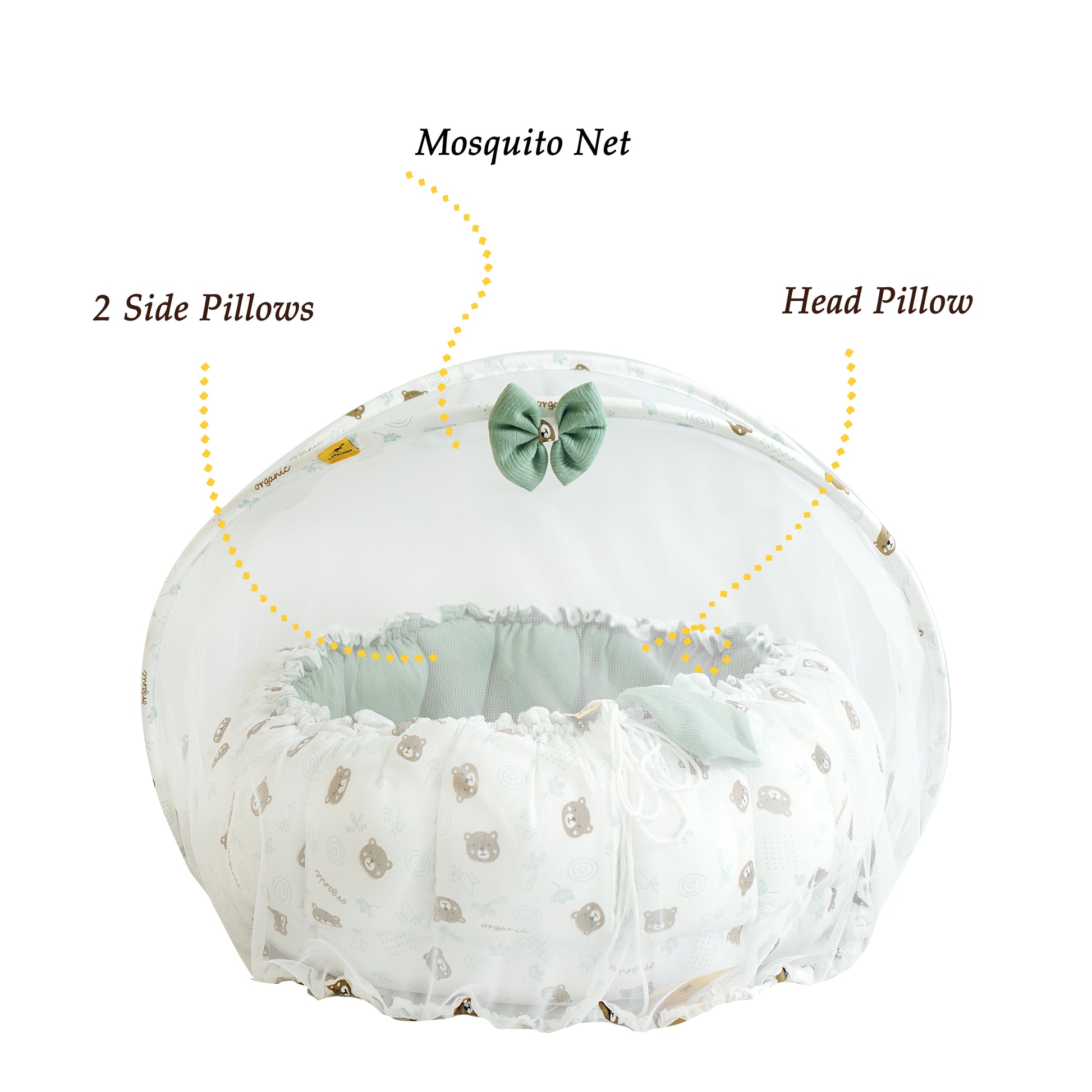 Full Protection: Comes with an integrated, high-quality mosquito net and a cushioned head pillow with two side pillows to ensure proper posture and safety.