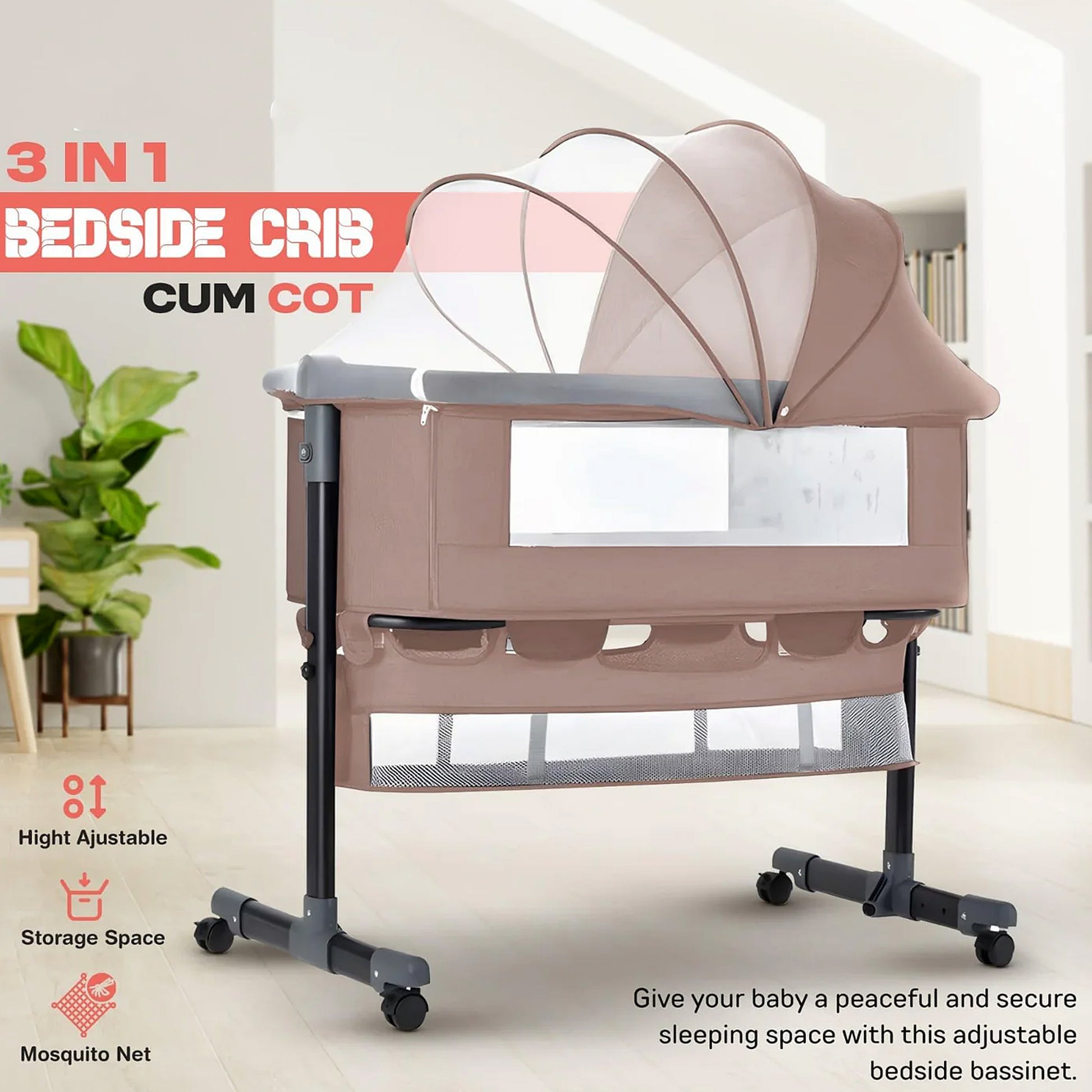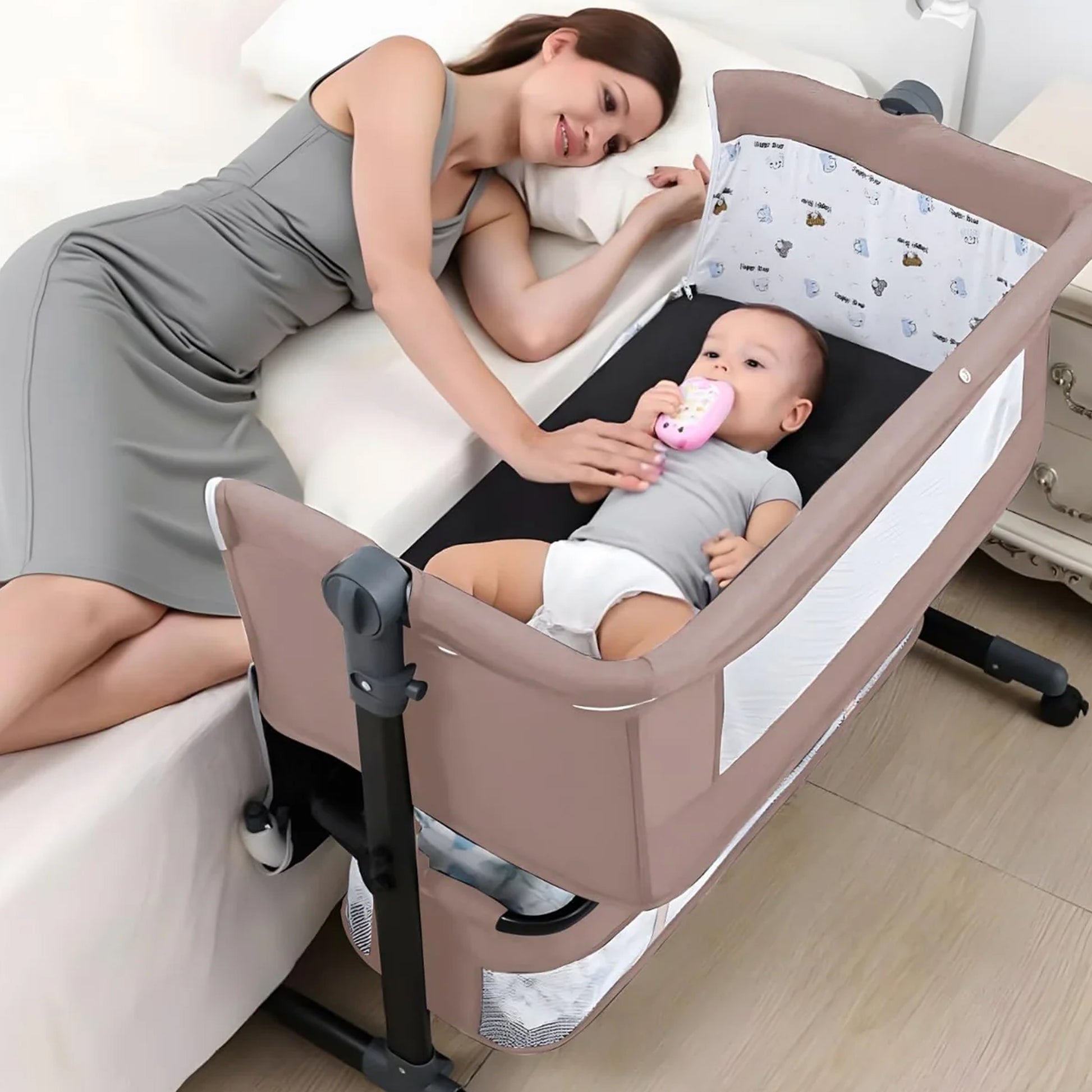 Baby Bedside Crib with 2 Height Adjustable Bed Cot