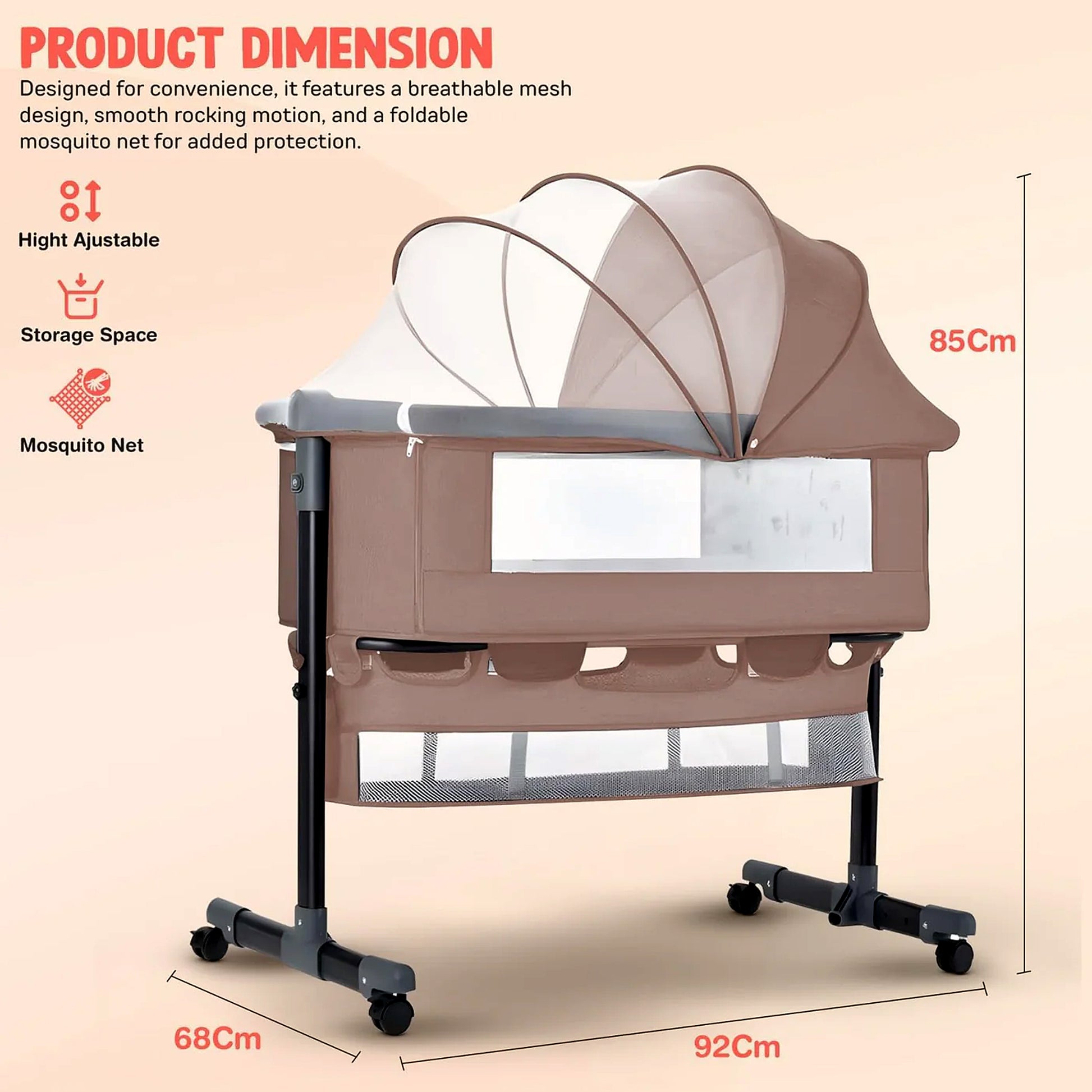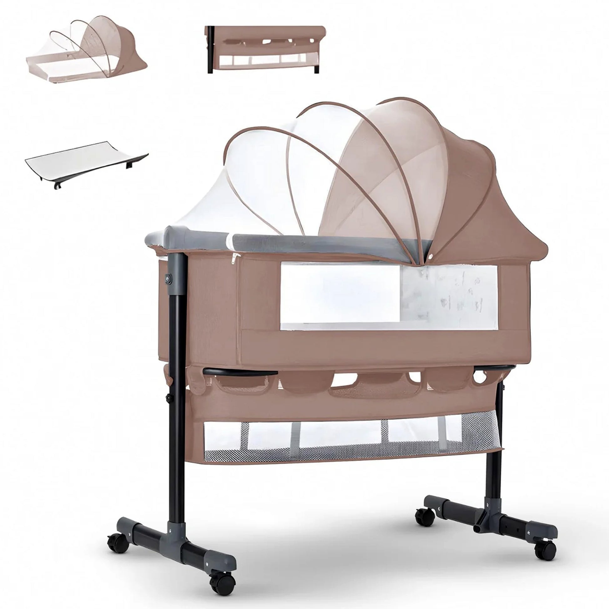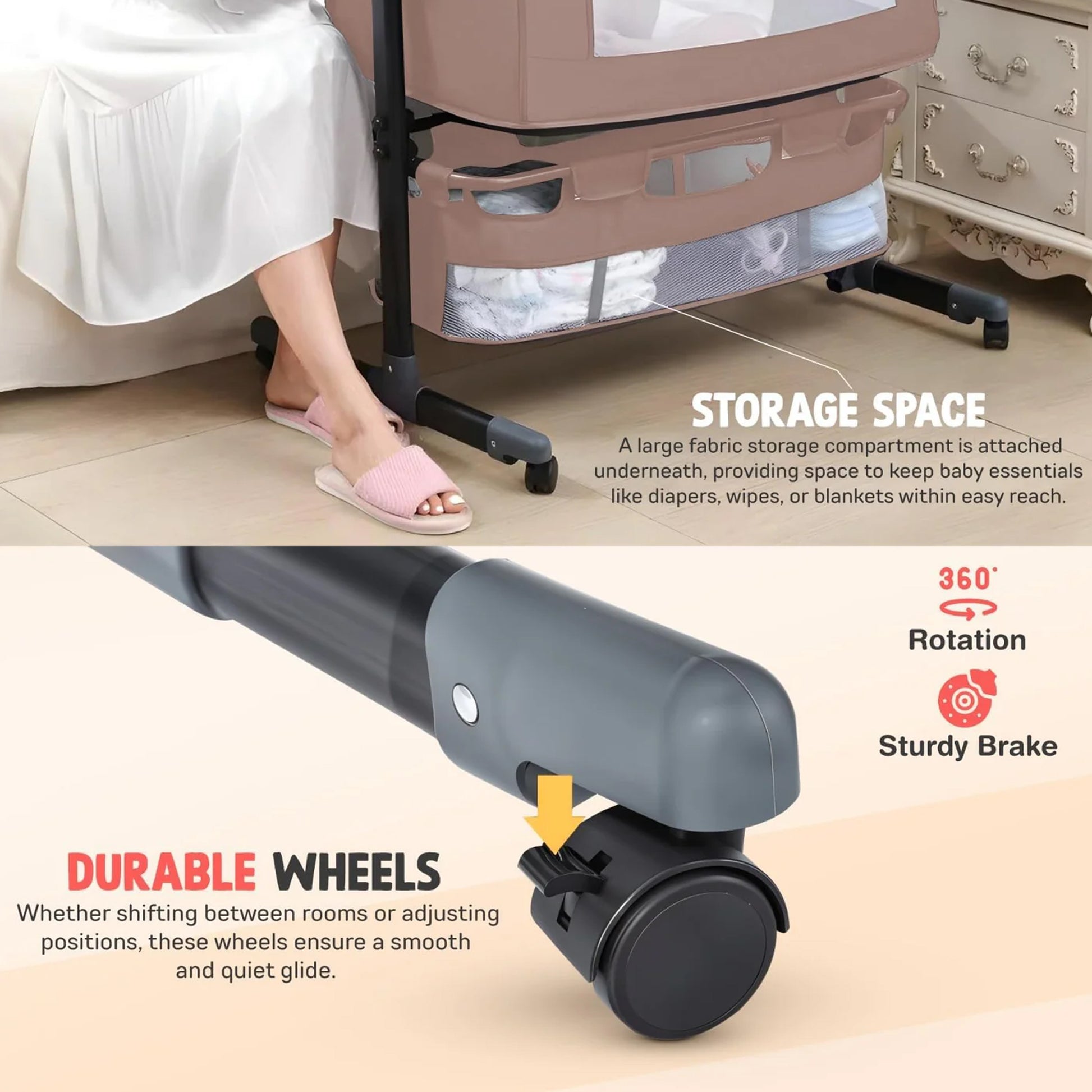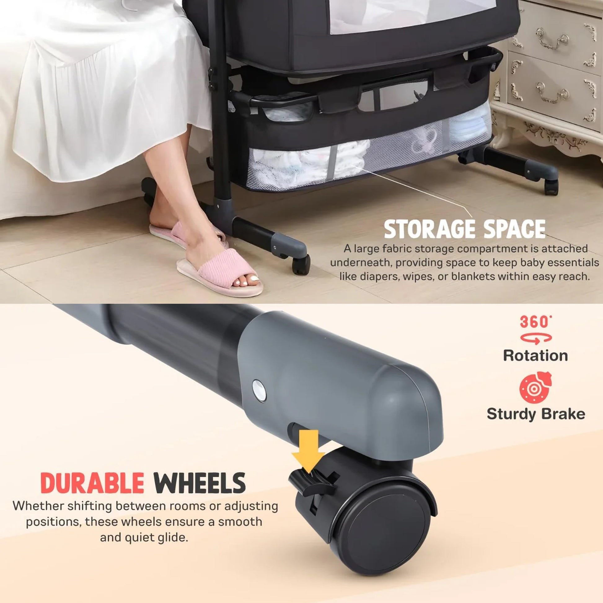 - 【3-in-1 Baby Bassinet & Bedside Sleeper】: 3-in-1 Baby Bassinet & Bedside Sleeper functions as a side-down baby bed, standalone crib, and gentle rocking cradle. Its 360° swivel wheels with brakes provide easy room-to-room movement while ensuring stability for secure and convenient baby care at all times.
