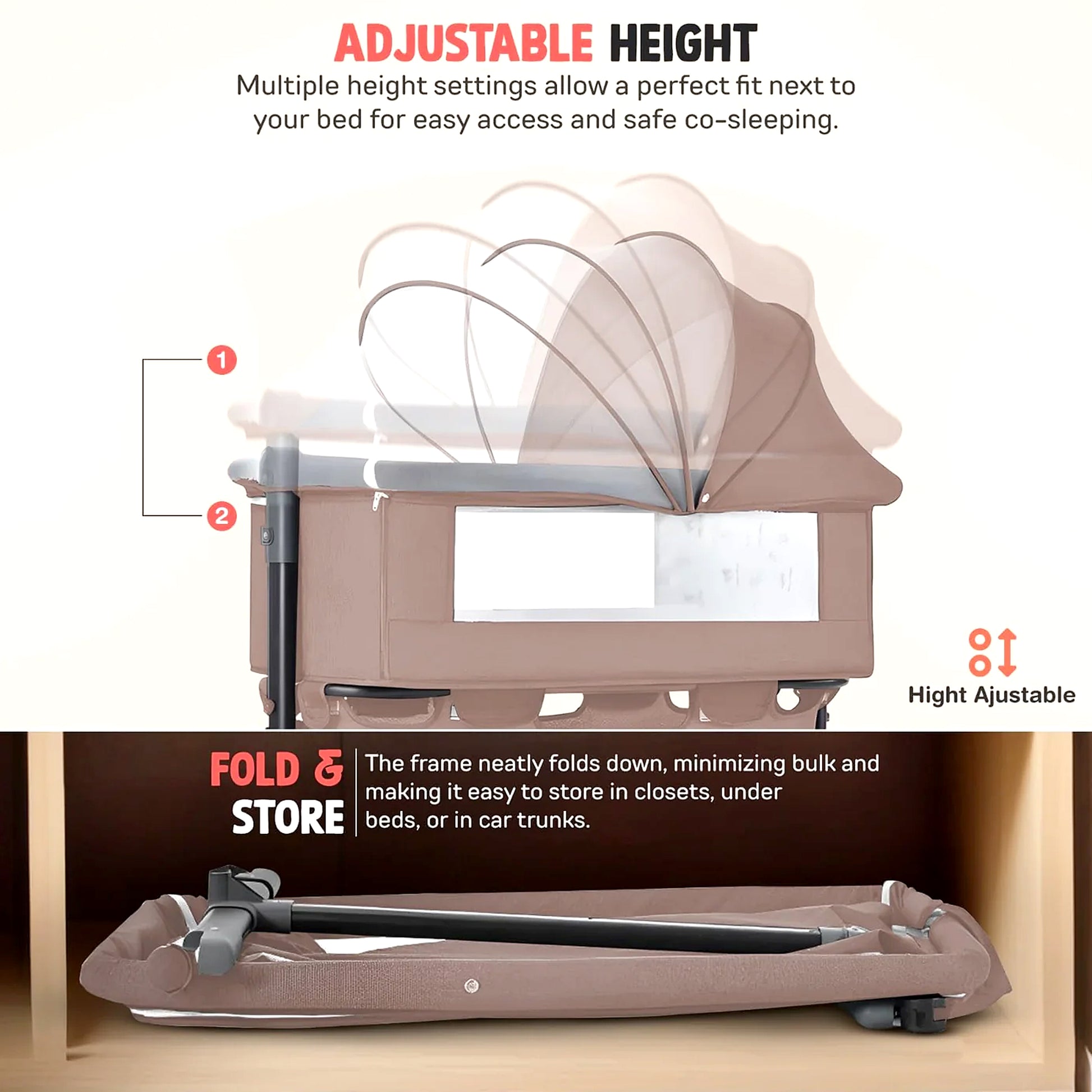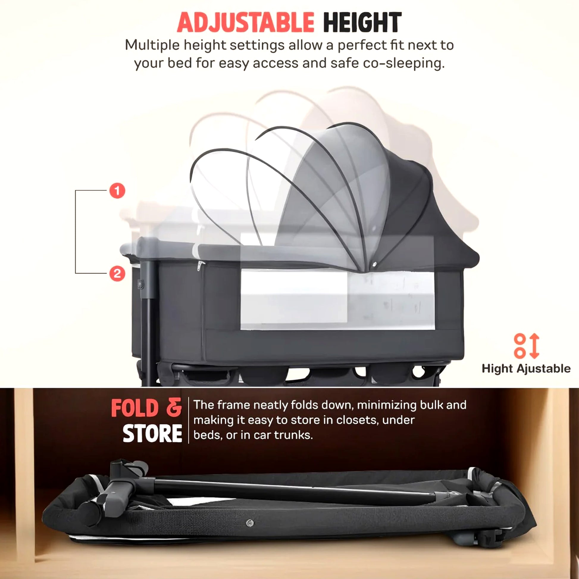 - 【2 Adjustable Height Levels】: Foldable bassinet offers 2 adjustable height settings, easily modified via the leg button to match the height of the adult bed. After feeding, you can adjust the angle to ensure your baby's comfort, providing a customizable sleep environment for optimal rest and convenience.