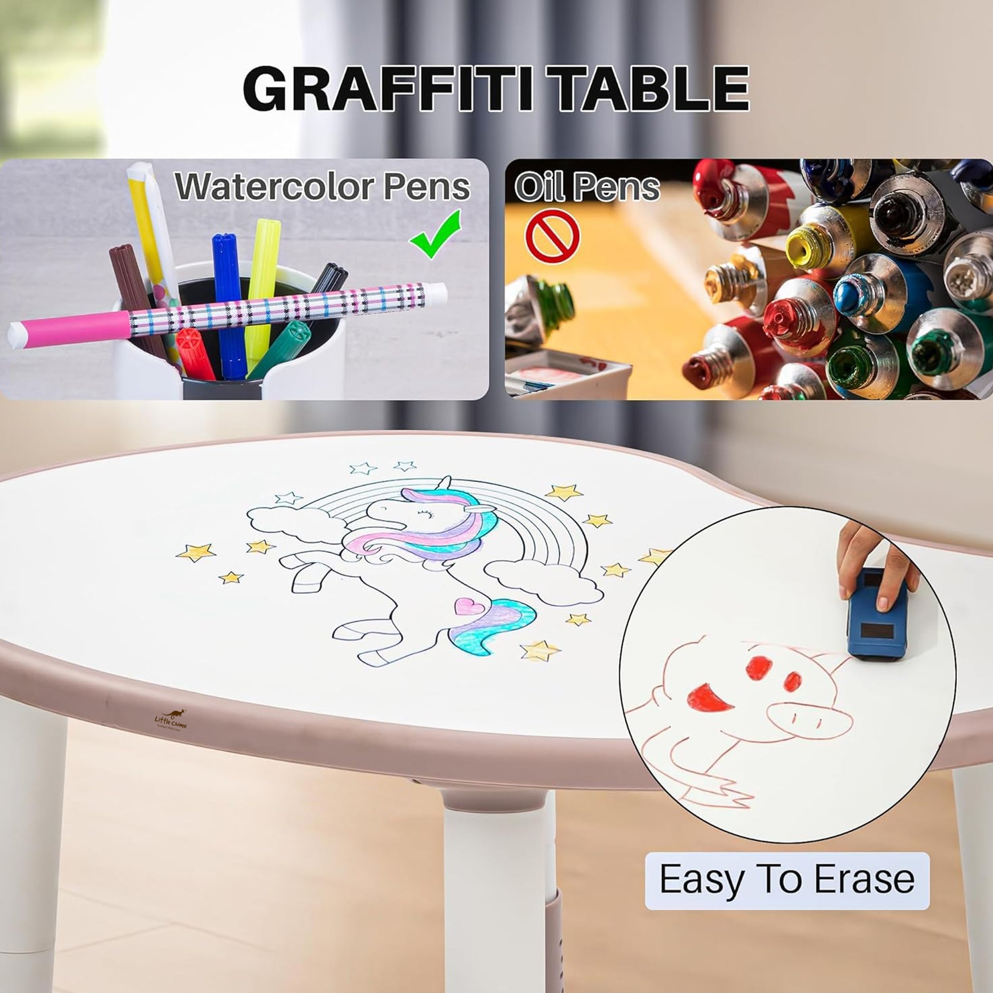 The Perfect Creative Companion: Features a child-safe graffiti surface ideal for watercolour pens, encouraging imaginative doodling. Avoid oil pens. The easy-to-erase surface allows for quick clean-up and mess-free creativity.