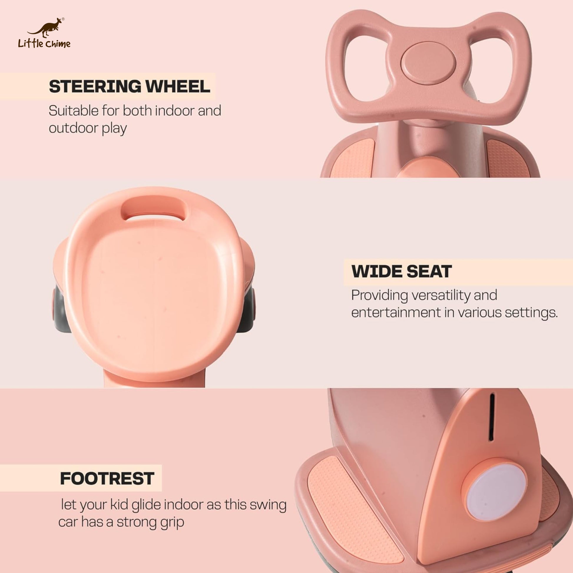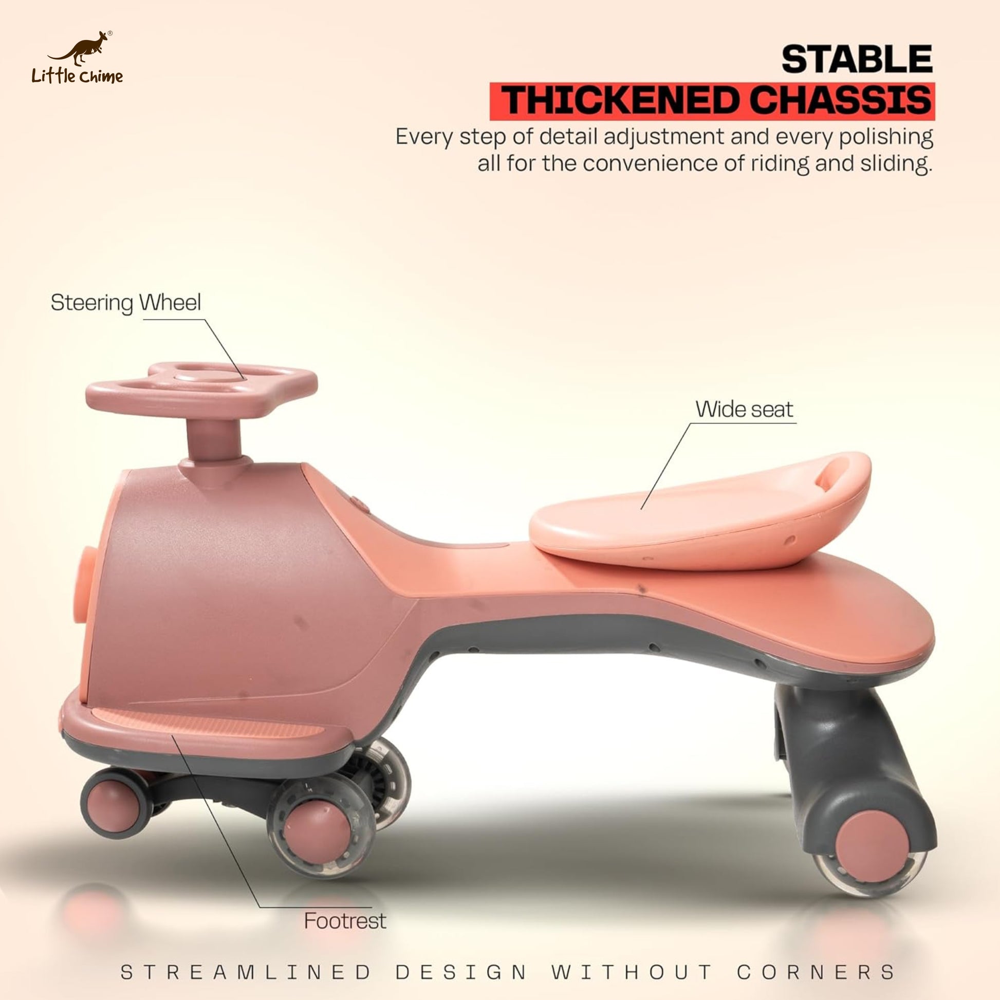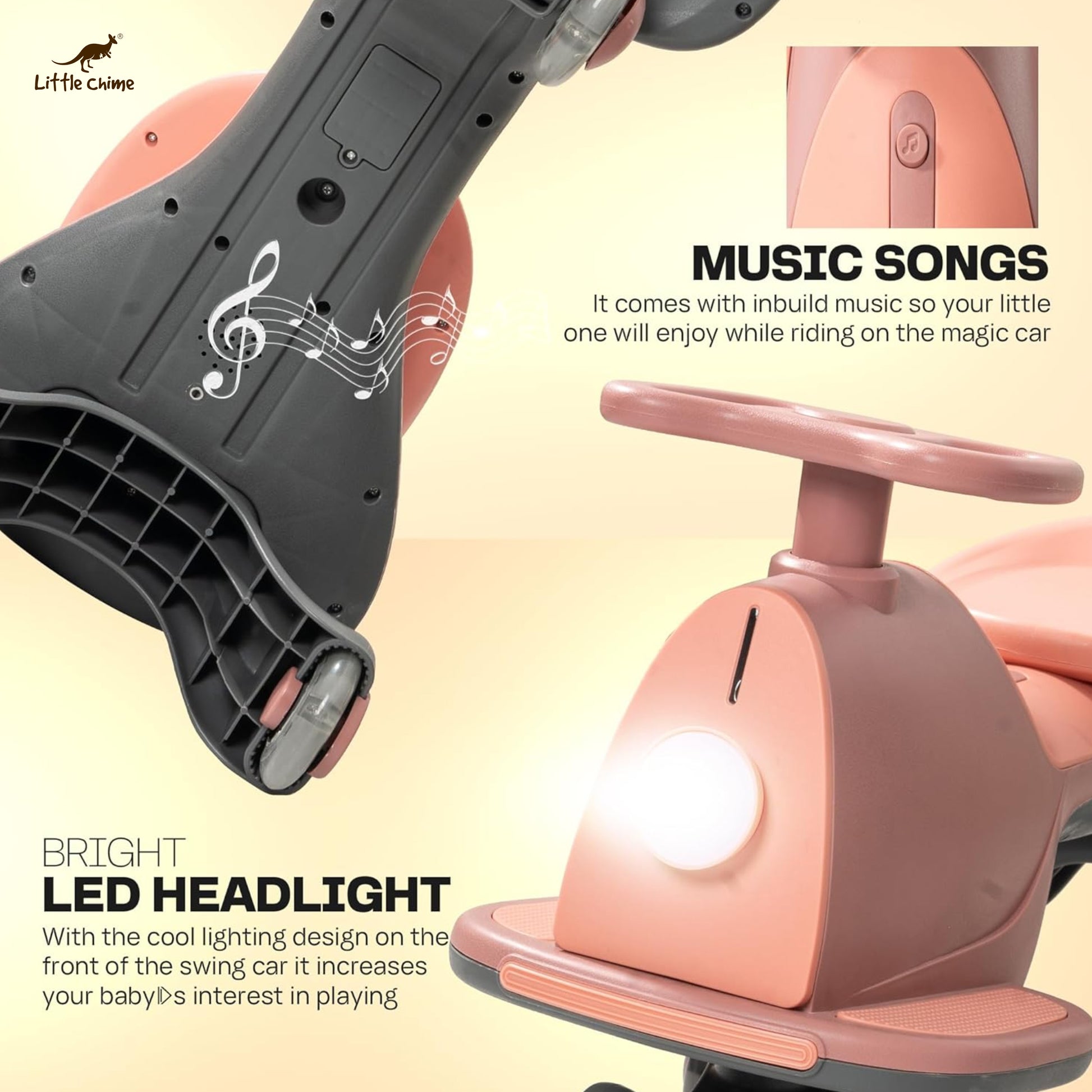 - Ride on Musical Magic Swing Car features smooth PP wheels, a steering wheel, and now, exciting RGB flashing LED PU wheels that combine effortless operation with a stylish look. This not only adds a cool factor to the ride but also enhances the overall driving experience for kids.